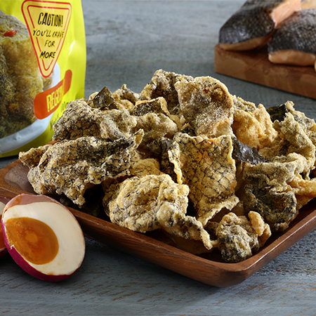 Made from premium Salmon Skin 100g, that is seasoned with REAL salted egg making it incredibly tasty and is oven-baked to perfection to give it a satisfying crunch. Sealed with Nitrogen and Desiccant inside to locked-in freshness and taste.